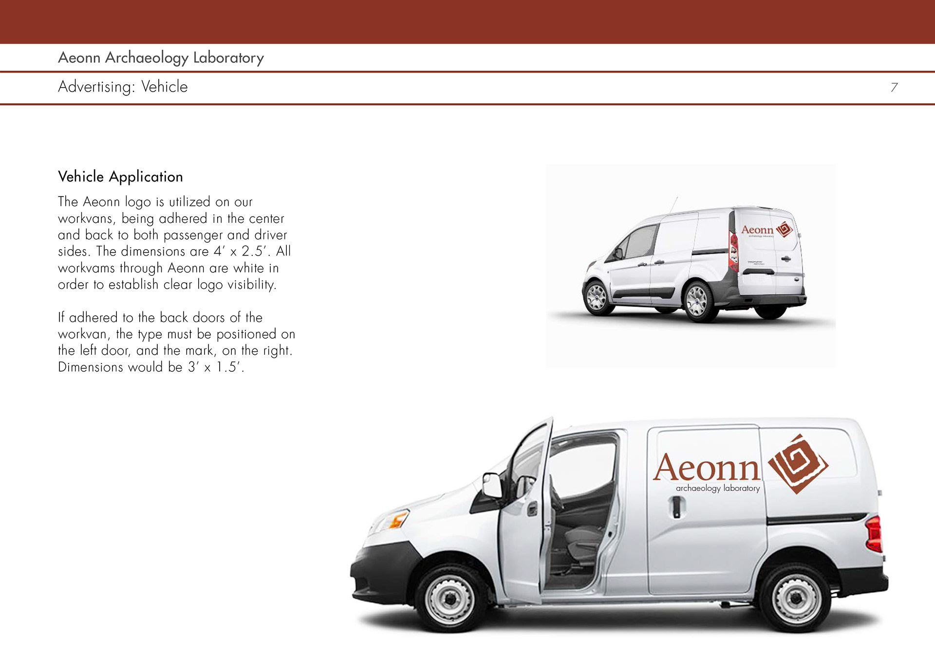 After designing a logo for Aeonn Archaeology Laboratory, I created a branding manual. This is an example of an interior page, in which I showcased with a vehicle logo application.