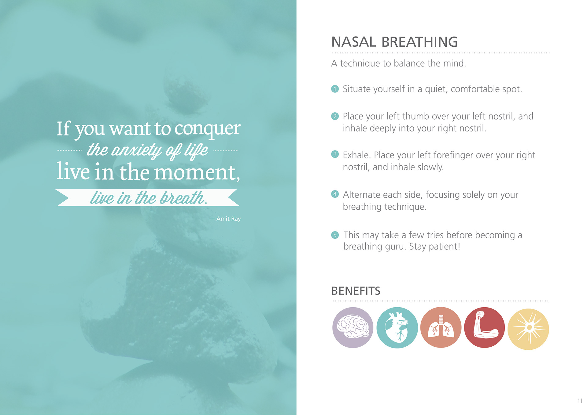 This is an example of the interior of my booklet, Take Ten to Zen. Please visit https://issuu.com/laurenyaro/docs/laurenyaro_pagesofguideto see the entire project.
